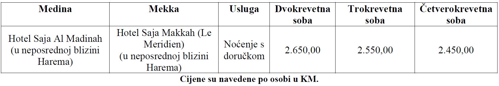 Sastanak putnika na Sarajevskom aerodromu u 10:30h. Let XY620 za Jeddu u 12:30h sa dolaskom u Jeddu u 18:55h. Nakon